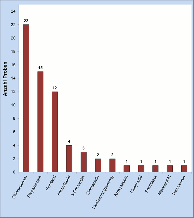 Die Häufigkeit der nachgewiesenen Wirkstoffe ist in Abbildung 3 dargestellt. In 38 Proben wurden insgesamt 12 verschiedene Wirkstoffe nachgewiesen. In 15 Proben wurde das Fungizid Propamocarb festgestellt, davon lagen bei sechs Proben die Gehalte unter der Bestimmungsgrenze. Bei den 22 Chlorpropham-Befunden handelt es sich, bis auf zwei Ausnahmen, nur um sehr geringe Gehalte. In einer Kartoffelprobe aus ökologischem Landbau wurde in geringfügiger Menge der Wirkstoff Chlorpropham nachgewiesen. Dies könnte durch eine Kontamination bei der Abpackung erfolgt sein. Chlorpropham soll die Auskeimung der eingelagerten Kartoffeln verhindern. Es darf nur gewerbsmäßig verwendet werden, z. B. in Betrieben mit Lagerhaltung. Die gewerbliche Anwendung von Chlorpropham muss mit der Angabe „nach der Ernte behandelt" kenntlich gemacht werden.
