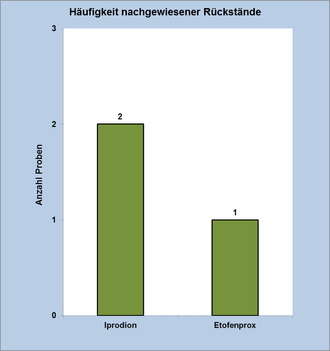 Bei der Untersuchung der Kiwiproben wurden nur zwei verschiedene Wirkstoffe in den beiden, aus italienischem Anbau stammenden Kiwiproben nachgewiesen und zwar das Fungizid Iprodion (2x) und das Insektizid Etofenprox (1x) (Abbildung 3).