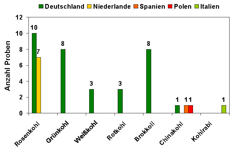 Die Herkunft der Proben zeigt Abbildung 1. Über Dreiviertel der Proben kam aus Deutschland, fast die Hälfte der Proben stammte aus Niedersachsen. Weitere Proben kamen aus den Niederlanden (Rosenkohl), Spanien und Polen (Chinakohl) und Italien (Kohlrabi).