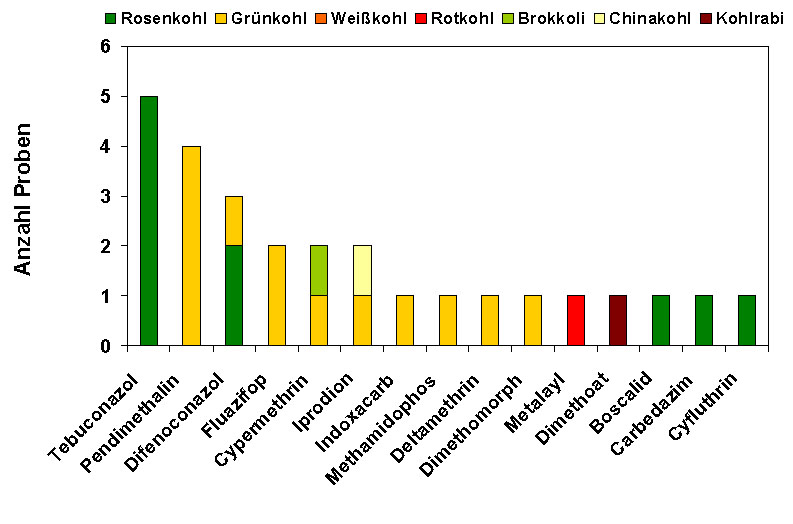 Über die Hälfte der Proben enthielt keine nachweisbaren Rückstände an Pflanzenschutzmitteln (acht Rosenkohl-Proben, drei Grünkohl-, drei Weißkohl-, zwei Rotkohl-, sieben Brokkoli- und zwei Chinakohl-Proben).