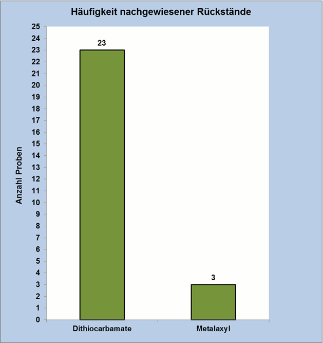 Die Untersuchung der Kohlrabiproben ergab, abgesehen von den nicht sicher aus Dithiocarbamaten stammenden Rückständen, nur noch den Nachweis von Metalaxyl in drei aus Deutschland stammenden Proben (Abbildung 3). Sowohl Metalaxyl als auch Dithiocarbamate werden als Fungizide eingesetzt.