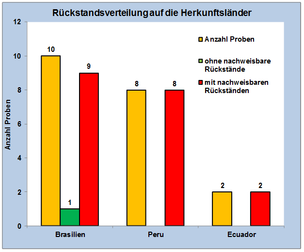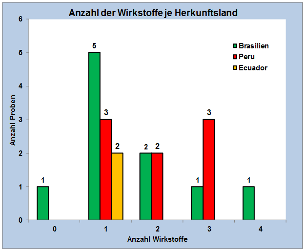 Abbildung 2 zeigt die Anzahl der nachgewiesenen Rückstände in den Mangoproben bezogen auf das angegebene Herkunftsland. Lediglich in einer Probe aus Brasilien waren keine Pflanzenschutzmittel nachweisbar. Mehrfachrückstände (mehr als ein Wirkstoff pro Probe) wurden in 9 Proben (= 45 %) der insgesamt 20 untersuchten Mangoproben bestimmt. Jeweils 4 Proben enthielten zwei bzw. drei Pestizidrückstände. In einer Probe Mango aus Brasilien wurden vier verschiedene Wirkstoffe nachgewiesen.