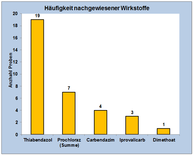 Abbildung 3 präsentiert die in den Proben nachgewiesenen Pflanzenschutzmittelwirkstoffe. Insgesamt wurden nur fünf verschiedene Pestizidrückstände in den Mangoproben bestimmt. Mit Abstand am häufigsten war das Fungizid Thiabendazol (19x) in den Proben enthalten.