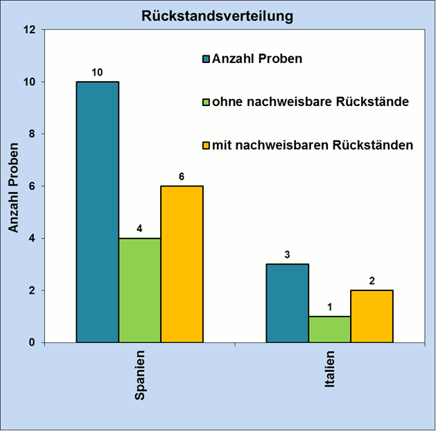 In insgesamt fünf Proben (= 38,5 %), darunter die Probe Wassermelone aus Bioanbau, wurden keine Rückstände nachgewiesen. In den übrigen acht Proben (= 61,5 %) waren Pflanzenschutzmittelrückstände bestimmbar. Höchstgehaltsüberschreitungen wurden jedoch nicht festgestellt. Die Verteilung der Rückstände auf die angegebenen Herkunftsländer zeigt Abbildung 2.