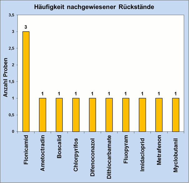 In acht Proben wurden insgesamt zehn verschiedene Rückstände nachgewiesen, davon dreimal des Insektizids Flonicamid.