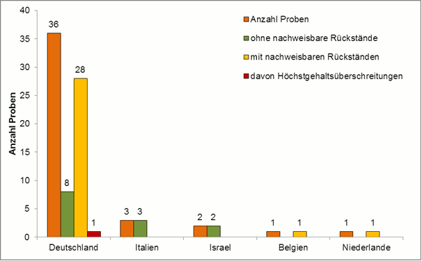Eine Höchstgehaltsüberschreitung trat in einer Probe deutschen Ursprungs auf. Von einem gesundheitlichen Risiko für Verbraucher ist nicht auszugehen.