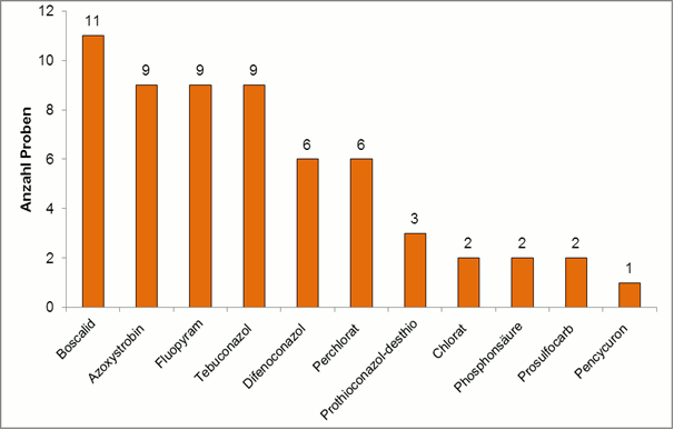 Bei der Untersuchung der Möhrenproben wurden insgesamt 11 verschiedene Wirkstoffe in den Proben nachgewiesen (siehe Abbildung 3). Die Fungizide Boscalid (11x), Azoxystrobin (9x), Fluopyram (9x) und Tebuconazol (9x) waren am häufigsten in den Proben enthalten.