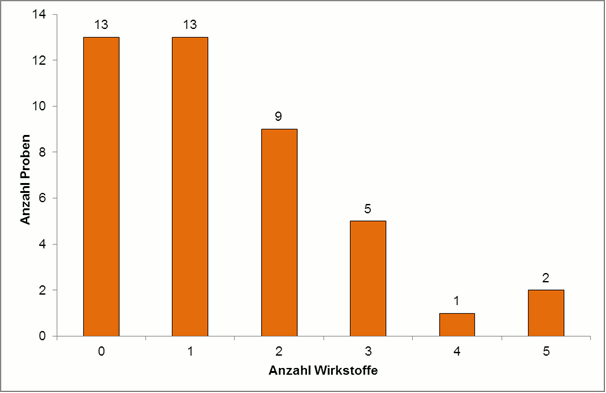 In 40 % der Möhrenproben wurden Mehrfachrückstände, d. h. mehr als ein Wirkstoff je Probe, bestimmt. 26 von 43 Proben Möhren enthielten keinen oder nur einen Pflanzenschutzmittelrückstand pro Probe. Zwei Proben aus Deutschland wiesen fünf verschiedene Wirkstoffrückstände auf (siehe Abbildung 2).