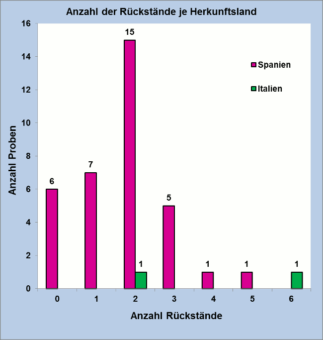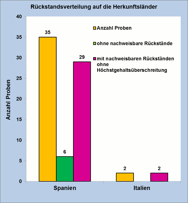 2018 hat das Lebensmittel- und Veterinärinstitut Oldenburg des LAVES insgesamt 17 Proben Pfirsiche, davon eine Probe aus Bioanbau, sowie 20 Proben Nektarinen auf Rückstände von Pflanzenschutzmitteln untersucht. In Abbildung 1 ist die Rückstandsverteilung auf die angegebenen Herkunftsländer Spanien und Italien zusammengefasst. Als Herkunftsländer der konventionell erzeugten 16 Pfirsichproben waren Spanien (14-mal) und Italien (2-mal) angegeben; die Pfirsichprobe aus biologischem Anbau stammte aus Spanien. Ebenfalls aus Spanien stammten die 20 Nektarinenproben aus konventioneller Produktion.
