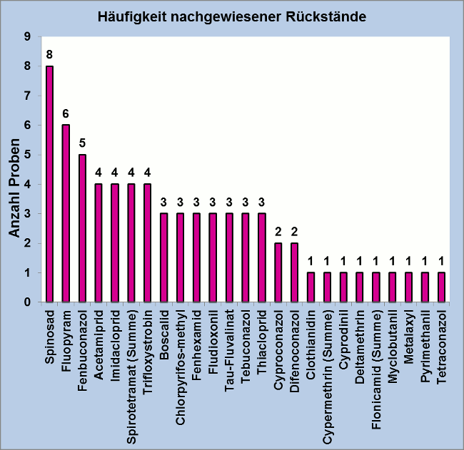 Fazit: In 84 % der Proben wurden Rückstände von Pflanzenschutzmitteln bestimmt. Das gegenüber 2016 veränderte Untersuchungsspektrum hat 2018 zu einer geringeren Häufigkeit von nachweisbaren Rückständen geführt.