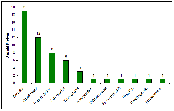 Ingesamt wurden bei der Untersuchung des Porrees elf verschiedene Wirkstoffe nachgewiesen (siehe Abbildung 3). Am häufigsten enthielten die Porreeproben die Fungizide Boscalid (19 Mal) und Chlorthalonil (12 Mal).