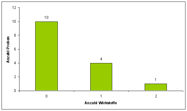 Wie in Abbildung 2 dargestellt, enthielt nur eine Rosenkohlprobe zwei verschiedene Rückstände, ansonsten wurde lediglich ein Rückstand pro Probe nachgewiesen.