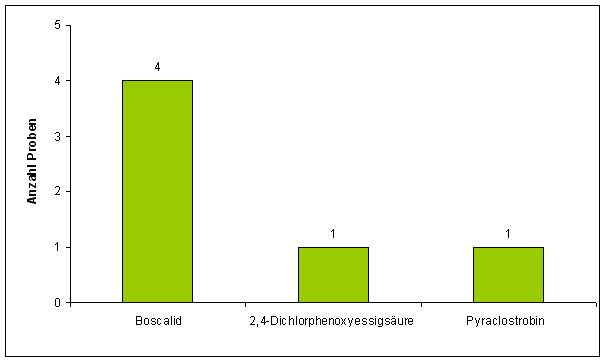 Abbildung 3 zeigt das Wirkstoffspektrum der in den Proben festgestellten Pflanzenschutzmittelwirkstoffe. Insgesamt wurden lediglich drei verschiedene Wirkstoffe in den Proben nachgewiesen. Der am häufigsten analysierte Wirkstoff ist das Fungizid Boscalid (vier Mal).