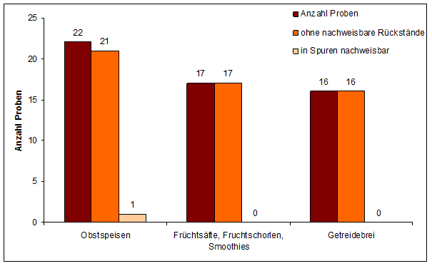 In allen 17 Proben Fruchtsäften, Fruchtschorlen und Smoothies sowie in allen 16 Proben Getreidebreie wurden keine Pflanzenschutzmittelrückstände nachgewiesen. 21 von 22 Obstspeisen waren ebenfalls rückstandsfrei. In allen untersuchten Bioprodukten wurden keine Wirkstoffrückstände bestimmt. Eine Obstspeiseprobe wies einen Rückstand in Spuren auf (<0,01 mg/kg). Es handelte sich hierbei um eine Apfel/Banane Früchtemischung.