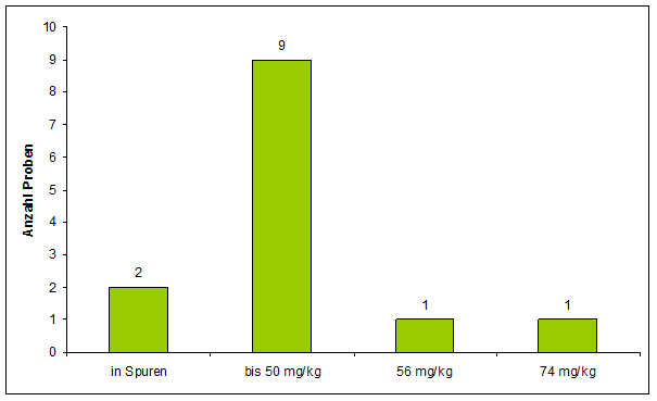 In zwei Proben waren nur Spuren von Nitrat feststellbar und in 9 weiteren Proben wurden Nitratgehalte unter 50 mg/kg nachgewiesen. Lediglich 2 Proben wiesen Gehalte von 56 mg/kg bzw. 74 mg/kg Nitrat auf. Der Nitrathöchstgehalt wurde in keiner Probe überschritten.