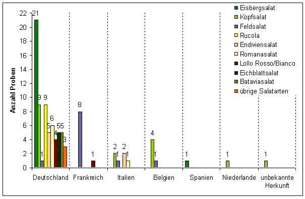 Abbildung 1 zeigt die Herkunft der Proben. 75% aller Salate kamen aus Deutschland. Weitere Proben stammten aus Frankreich (9x), Italien (6x), Belgien (5x) und jeweils eine Probe kam aus Spanien, Frankreich und den Niederlanden.