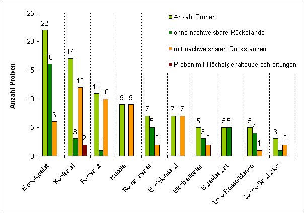 Im Lebensmittel- und Veterinärinstitut Oldenburg des LAVES wurden im Jahr 2011 insgesamt 91 Salatproben auf Pflanzenschutzmittelrückstände untersucht. Es handelte sich um 22 Proben Eisbergsalat, 17 Proben Kopfsalat, 11 Proben Feldsalat, 9 Rucolaproben, 7 Proben Romanasalat, 7 Endiviensalatproben, jeweils 5 Proben Eichblattsalat, Bataviasalat, und Lollo Rosso/Bianco sowie 3 Proben weiterer Salatarten. 11 Proben stammten aus biologischem Anbau (alle 5 Bataviasalate, 2x Eichblattsalat, 2x Lollo Rosso/Bianco, 1x Eisbergsalat, 1x Kopfsalat).