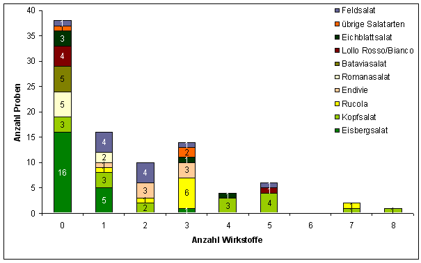 Insgesamt wurden in den Proben 41% Mehrfachrückstände bestimmt (Abbildung 3). Auffällig sind der Feldsalat, Rucola, die Endivien, und die Kopfsalate. Keine Rucola- und Endivienprobe war rückstandsfrei. 86% der Endivien-, 78% der Rucola- und 65% der Kopfsalatproben wiesen mehr als einen Wirkstoff auf. Zwei Proben (1x Rucola und 1x Kopfsalat) enthielten 7 verschiedene Wirkstoffe bzw. ein belgische Probe Kopfsalat enthielt acht verschiedene Wirkstoffe.