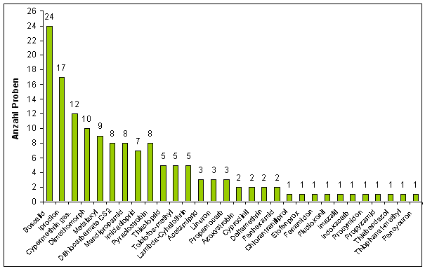 In den Salaten wurden insgesamt 30 verschiedene Wirkstoffe nachgewiesen (siehe Abbildung 4). Hauptsächlich enthielten die Salatproben die Fungizide Boscalid (24x) und Iprodion (17x).