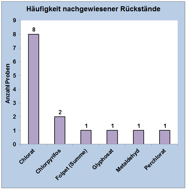 Insgesamt waren sechs verschiedene Rückstände in den Proben nachweisbar. Perchlorat, das hauptsächlich aus Düngemitteln stammt, wurde nur in einer Probe bestimmt. Mit acht Mal am häufigsten war das ehemals auch in der EU als Pestizid zugelassene Chlorat in den Proben feststellbar. Chloratrückstände in Lebensmitteln werden jedoch hauptsächlich auf Desinfektions- und Reinigungsmittel sowie auf gechlortes Wasser zurückgeführt.