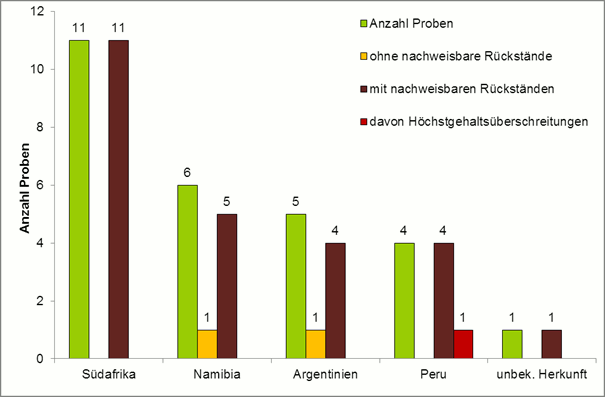 Lediglich in 2 Proben Trauben aus Namibia und Argentinien waren keine nachweisbaren Rückstände von Pflanzenschutzmitteln enthalten. Eine rote Traubenprobe aus Peru wies eine Höchstgehaltsüberschreitung des Wirkstoffs Ethephon auf.