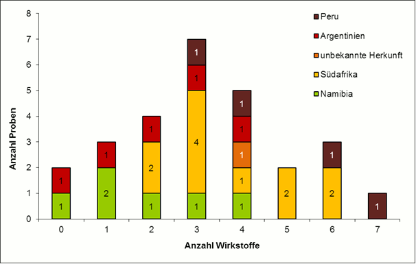 In Abbildung 2 ist die Anzahl der nachgewiesenen Rückstände dargestellt. Insgesamt enthielten 81 % der Trauben Mehrfachrückstände, d. h. mehr als ein Wirkstoff pro Probe. Eine Probe aus Peru enthielt 7 verschiedene Wirkstoffe, überwiegend konnten 2 bis 4 Wirkstoffe analysiert werden. In den Proben aus Argentinien und Namibia waren maximal 4 Wirkstoffe enthalten.