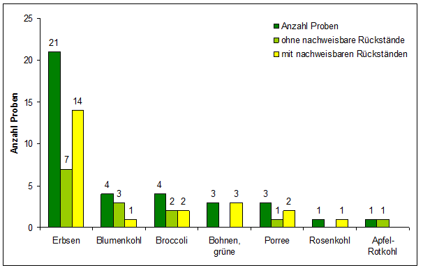 In 14 Gemüseproben (7x Erbsen, 3x Blumenkohl, 2x Broccoli, 1x Porree und 1x Apfelrotkohl) wurden keine Rückstände nachgewiesen, darunter alle Proben aus ökologischem Anbau. KeineProbe enthielt Rückstände oberhalb der gesetzlich festgelegten Höchstgehalte.