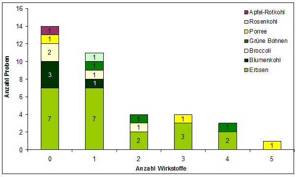 Im Lebensmittel- und Veterinärinstitut Oldenburg wurden im Jahr 2012 insgesamt 37 tiefgefrorene Gemüseproben auf Rückstände von Pflanzenschutzmitteln untersucht. Es handelte sich dabei um 21 Proben tiefgekühlte Erbsen, jeweils 4 Proben Broccoli und Blumenkohl, je 3 Proben Grüne Bohnen und Porree sowie jeweils eine Tiefkühlprobe Rosenkohl und Apfelrotkohl. Aus Belgien stammten 2 Proben Erbsen und jeweils eine Probe Blumenkohl, Broccoli und Porree. Eine weitere Probe Blumenkohl kam aus Deutschland. Bei den anderen tiefgefrorenen Proben ist die Herkunft nicht bekannt, da eine Angabe des Ursprungslands gesetzlich nicht gefordert ist. 5 Proben Tiefkühlgemüse (4x Erbsen und 1x Apfelrotkohl) stammten aus ökologischem Landbau. Die Ergebnisse der Rückstandsuntersuchungen sind in Abbildung 1 dargestellt.