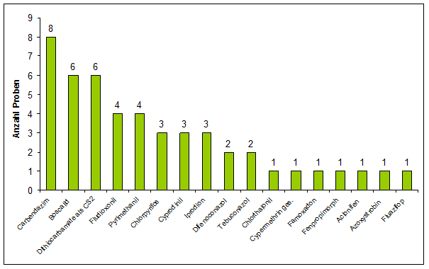 Bei der Untersuchung der Gemüseproben wurden insgesamt 17 verschiedene Wirkstoffe in den gefrorenen Proben nachgewiesen (Abbildung 3). Am häufigsten trat das Fungizid Carbendazim (8x) in den Proben auf.