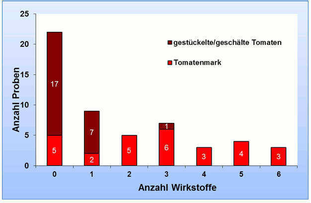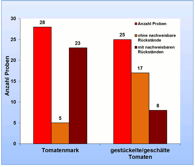 In Tomatenmark sind deutlich mehr Wirkstoffe als in gestückelten beziehungsweise geschälten Tomaten nachweisbar. Im Vergleich mit frischen Tomaten sind in den untersuchten Tomatenerzeugnissen deutlich weniger Pflanzenschutzmittelrückstände feststellbar.