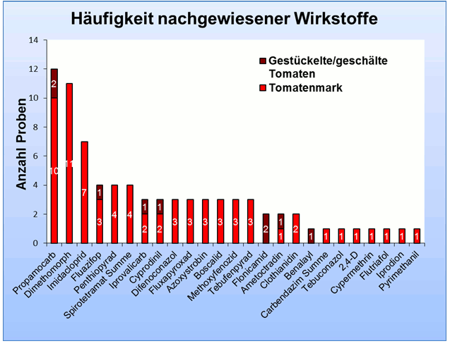 Die gestückelten/geschälten Tomatenproben enthielten insgesamt sieben verschiedene Wirkstoffe, während im Tomatenmark 23 Wirkstoffe nachgewiesen wurden (siehe Abbildung 3). Am häufigsten wurden die Fungizide Propamocarb (12 Mal) und Dimethomorph (11 Mal) sowie das Insektizid Imidacloprid (7 Mal) bestimmt.