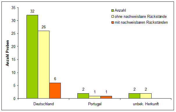 Im Lebensmittel- und Veterinärinstitut Oldenburg des LAVES wurden im 1. Quartal 2013 insgesamt 36 Proben Weißkohl aus konventionellem Anbau auf Pflanzenschutzmittelrückstände untersucht. Hauptsächlich kamen die Proben aus deutschem Anbau (32x). Zwei Proben entstammten aus Produktionen in Portugal. Bei zwei weiteren Weißkohlproben war das Ursprungsland nicht bekannt. Eine Zusammenfassung der Untersuchungsergebnisse ist in Abbildung 1 dargestellt.