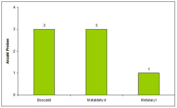 Abbildung 3 zeigt die in den Proben nachgewiesenen Pflanzenschutzmittelwirkstoffe. Insgesamt wurden lediglich 3 verschiedene Wirkstoffrückstände in den Weißkohlproben bestimmt, davon waren das Fungizid Boscalid und das Molluskizid Metaldehyd (wirkt gegen Schnecken) jeweils 3x in den Proben enthalten.