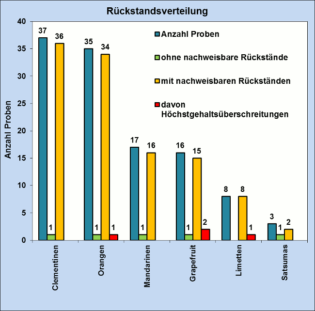 Im Jahr 2017 wurden im Lebensmittel- und Veterinärinstitut Oldenburg des LAVES insgesamt 116 Proben Zitrusfrüchte, 37 Mal Clementinen, 35 Mal Orangen, 17 Mal Mandarinen, 16 Mal Grapefruit, 8 Mal Limetten und 3 Mal Satsumas, auf Pflanzenschutzmittelrückstände untersucht.