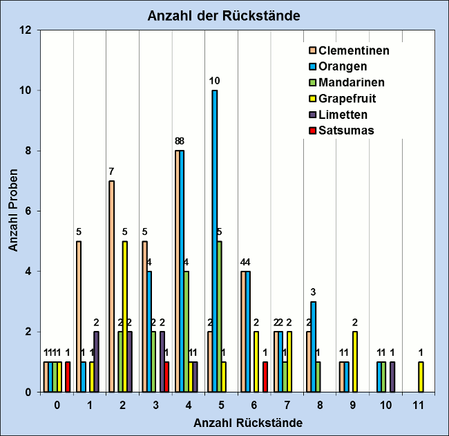 Die Untersuchungen haben gezeigt, dass konventionell erzeugte Zitrusfrüchte fast immer Pestizidrückstände aufweisen, und diese größtenteils als Mehrfachrückstände vorliegen. Erfreulicherweise waren die Bioproben so gut wie rückstandsfrei; Schalenbehandlungsmittel in Spuren können hier auch auf Verschleppung durch Transportbänder etc. beruhen.