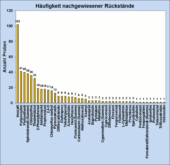 Bei der Untersuchung der Zitrusfrüchte wurden insgesamt 44 verschiedene Wirkstoffe in den Proben nachgewiesen (siehe Abbildung 4). Mit Abstand am häufigsten war das als Schalenbehandlungsmittel eingesetzte Fungizid Imazalil (102x) in den Proben enthalten, gefolgt von dem Insektizid Pyriproxyfen (41x) und dem Fungizid Pyrimethanil (40x).