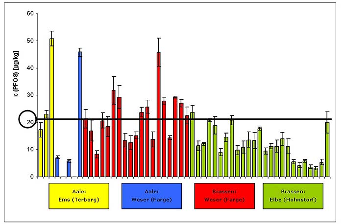 Aufgrund früherer positiver Befunde von PFOS in Flussfischen wurden auch 2008 insgesamt 52 Fische (Muskel von Aalen und Brassen) auf perfluorierte Tenside untersucht. Die Fische stammten aus der Ems bei Terborg, aus der Weser bei Farge und aus der Elbe bei Hohnstorf.