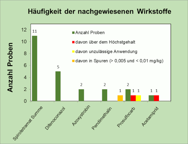 Es wurden in den Proben zwischen ein und fünf Wirkstoffe nachgewiesen. Acht Proben (= 44 Prozent) wiesen Mehrfachrückstände, das heißt mehr als zwei Wirkstoffe pro Probe auf. Die Anzahl von drei Wirkstoffen wurde dabei am häufigsten festgestellt (in fünf Proben = 27 Prozent).