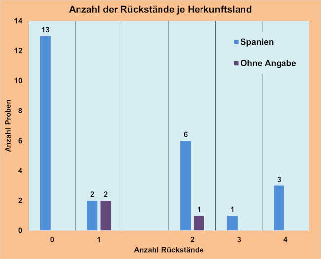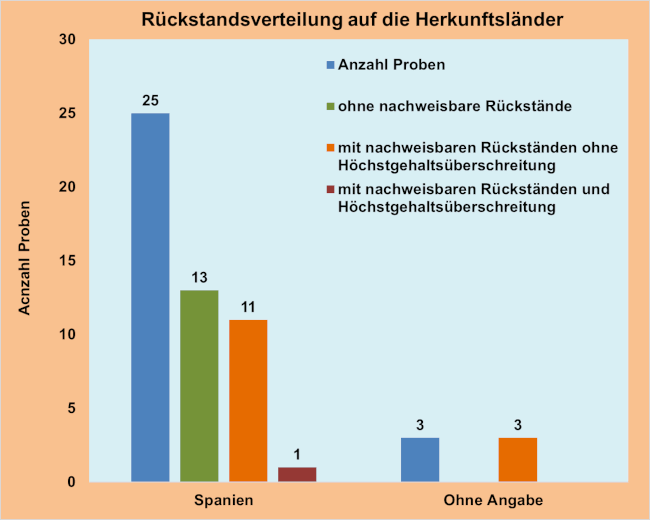 Davon stammten 25 Proben aus Spanien, darunter eine Bioprobe. Bei weiteren drei Proben aus konventioneller Erzeugung war das Anbauland nicht angegeben.