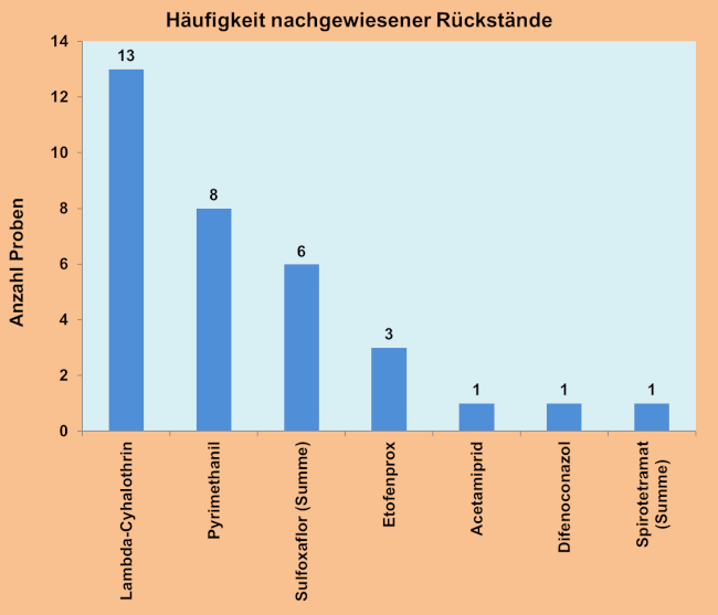 In den übrigen 15 Proben (= 54 Prozent) wurden Rückstände von Wirkstoffen aus Pflanzenschutzmitteln nachgewiesen.