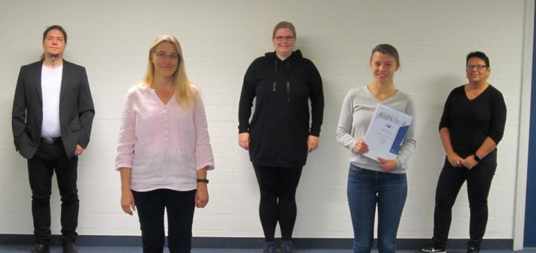 Die feierliche Ehrung fand direkt in den jeweiligen Ausbildungsbetrieben statt und nicht, wie sonst üblich, im größeren Rahmen in der Weser-Ems-Halle mit rund 1.000 Teilnehmenden. Im kleinen Kreis und mit Abstand überreichte Angelika Grönheim von der IHK Oldenburg die Urkunden an die ehemaligen Auszubildenden. Über den Erfolg freuten sich ebenfalls die anwesenden Ausbildungsleiterinnen sowie der Institutsleiter Jörg Lay und der Institutsabteilungsleiter Dr. Jens Brackmann.