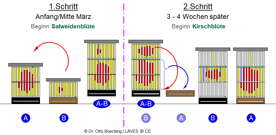 Abbildung: Das „Boostern“ von 1-zargigen schwachen Völkern auf starken 2-zargigen Völkern.
