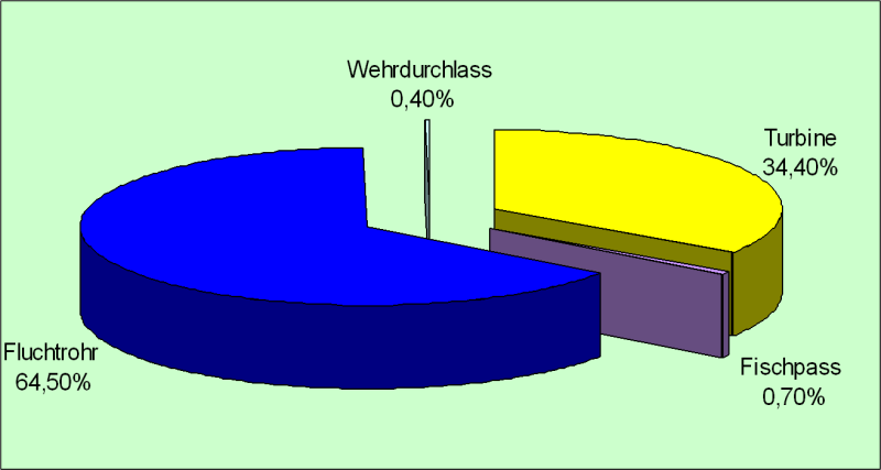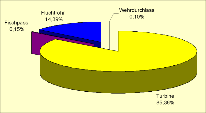 Da der Anteil der insgesamt wiedergefangenen Lachse 16,4 Prozent betrug, aber anzunehmen ist, dass die Abwanderung der markierten Lachse im Untersuchungszeitraum im wesentlichen erfolgte, wurden die Fangdaten unter der Annahme, und das Fangnetz in der Oker nur eine eingeschränkte Fängigkeit aufwies, korrigiert. Unter Berücksichtigung des berechneten Fangkorrekturfaktors ergibt sich die folgende Verteilung der Abwanderungsraten für die besetzten markierten Lachse: 14,4 Prozent Fluchtrohr und 85,4 Prozent Turbine (Abbildung 2).