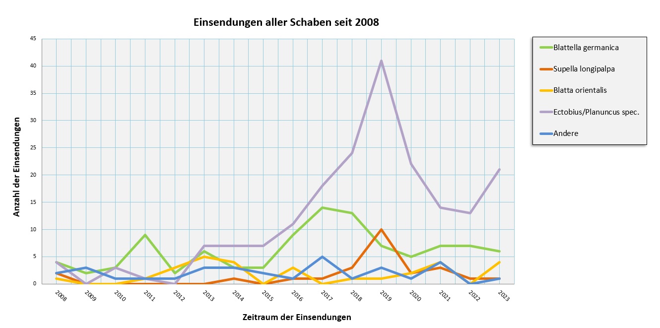 Die gemeldeten Waldschabenfunde (Ectobius-Arten und Planuncus tingitanus) überholten 2023 die Funde der Deutschen Schabe (Blattella germanica) deutlich - trotzdem waren es häufig Einzelfunde. Besonders 2019 stach mit über 40 Fundmeldungen von Waldschaben deutlich hervor. Zwar hat die Anzahl der Einsendungen in den Folgejahren abgenommen, aber die Waldschaben machten nach wie vor den Großteil der eingeschickten Tiere aus.