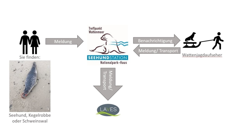 Die Seehundstation Norddeich nimmt die Meldungen aller Funde von Meeressäugern in Niedersachsen entgegen. Anschließend werden die Informationen an die Wattenjagdaufseher weitergeleitet. Die Wattenjagdaufseher kontrollieren ehrenamtlich den Fund und nehmen Grunddaten zu dem Tier auf. Eine Auswertung der Daten erfolgt anschließend durch das LAVES. Eine Bestimmungshilfe für tot aufgefundene Meeressäuger kann eine erste Einschätzung erleichtern.