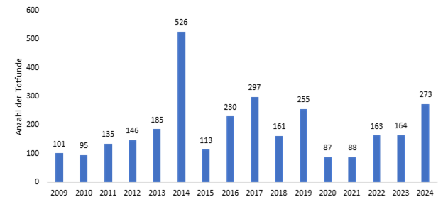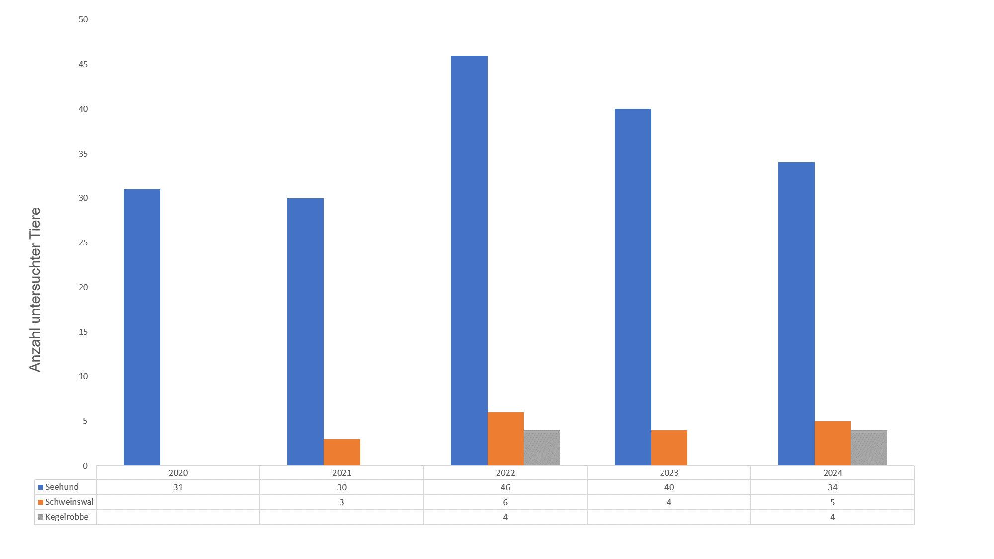 In den Jahren 2020 bis 2024 wurden insgesamt 207 kleine Meeressäuger in Niedersachsen untersucht.Ausgewählte Untersuchungsergebnisse