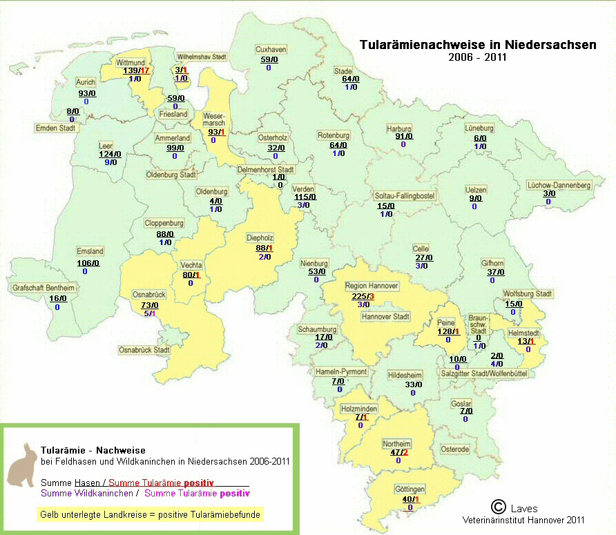 Bei 51 (zwei Prozent) Feldhasen (39 Fallwild, zwölf erlegte Hasen) und einem (1,5 Prozent) Wildkaninchen wurde F. tularensis ssp. holarctica nachgewiesen. Die meisten Erregernachweise erfolgten in den Landkreisen Wittmund und Vechta sowie in der Region Hannover.