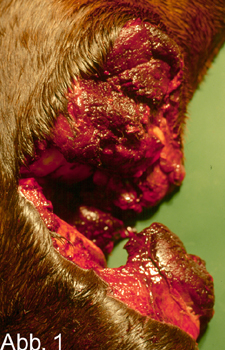 Eingeliefert wurde der Körper einer Stute, die tot auf der Weide aufgefunden worden war. Das Tier war aus einer tiefen, in horizontaler Richtung verlaufenden und bis zum Knochen reichenden Zusammenhangstrennung an der Vorderseite des rechten Ellenbogens verblutet (Abb.1). Die spektakuläre Art der Wunde ließ zunächst den Verdacht zu, dass eine vorsätzliche und damit tierschutzrelevante Handlung vorlag ("Pferderipper").