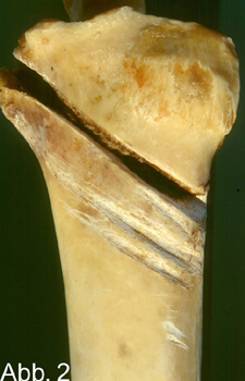 Aufgrund des Polizeiberichtes und der Befunde bei der Zerlegung konnte Fremdeinwirkung sicher ausgeschlossen werden. Vielmehr zeigte die Untersuchung des Unterarmknochens eindeutig, dass eine Sägeverletzung durch einen drahtähnlichen rostigen Gegenstand zur Durchtrennung von Weichteilgeweben und dem oberen Teil der Elle geführt haben mußte (Abb.2).
